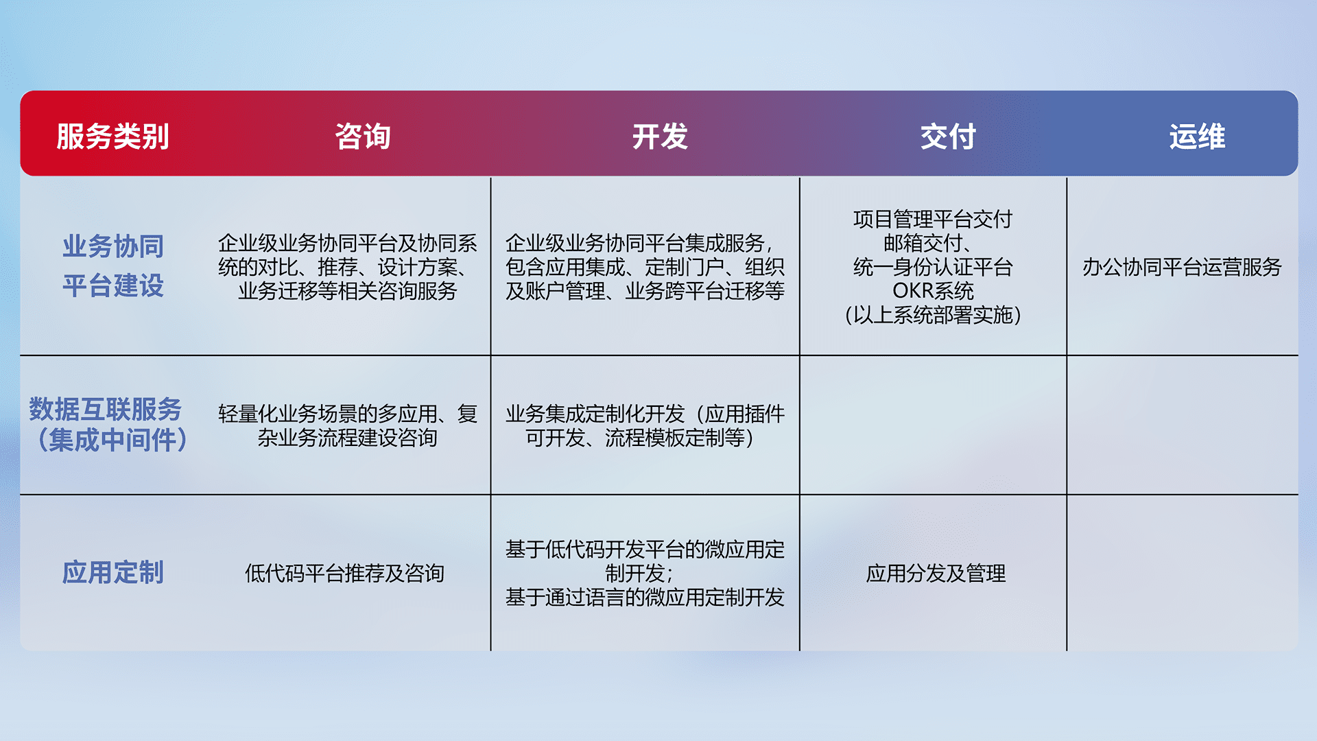 针对钉钉、、、企微、、、、IDaas等平台级产品提供产品的规划、、、方案、、、、交付、、、定制化开发等服务,,,,实现如统一协同办公、、、、智能客户服务、、混合会议管理、、、、智能数据查询、、等业务场景,,实现数字化转型。。。